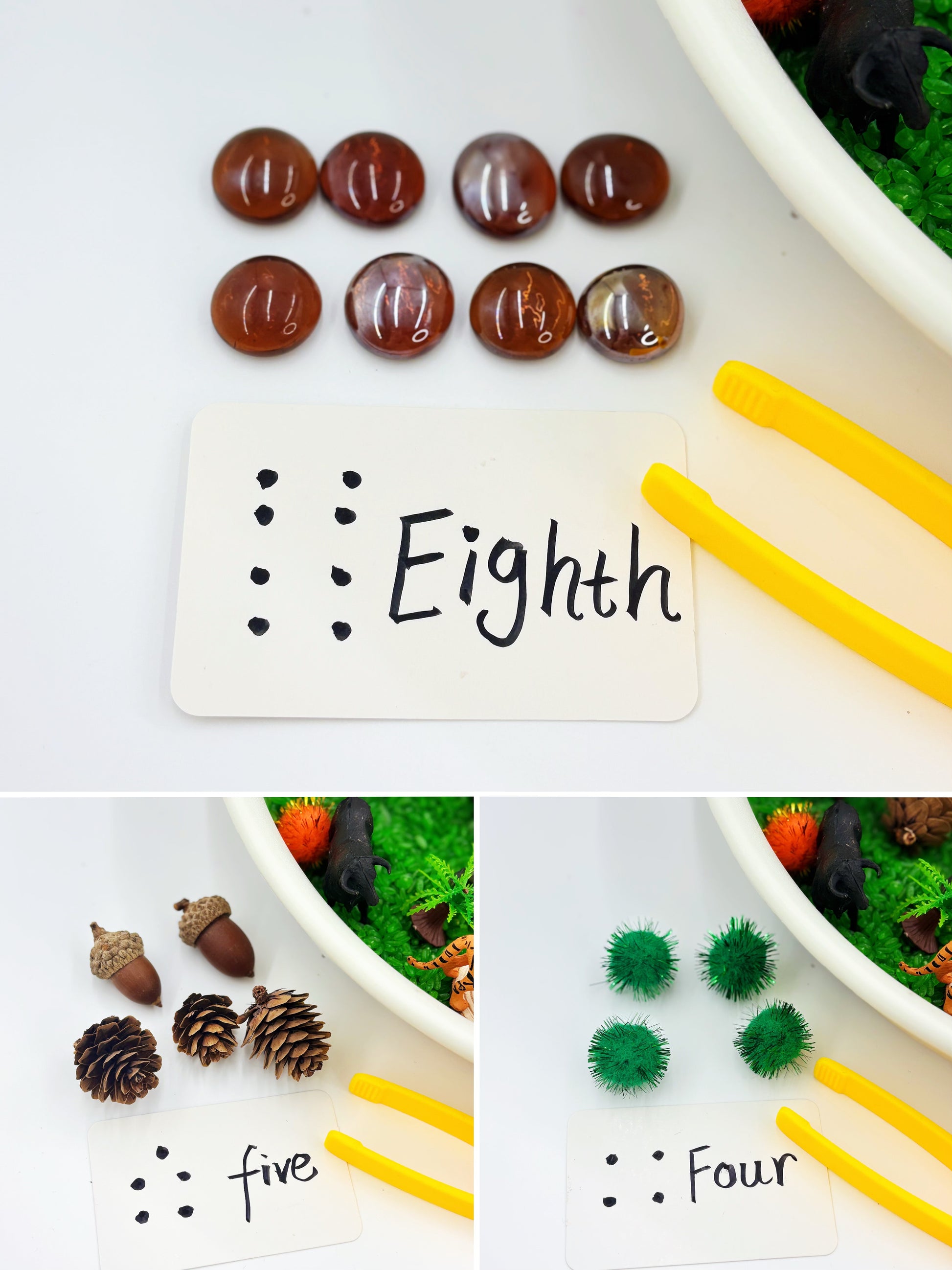 | Construction & Fine Motor | Essential for developing pincer grip, precision, and building skills. | Tweezers (1), Mini-Wood Stakes (5), Twisters (9), Pompoms (10) |
