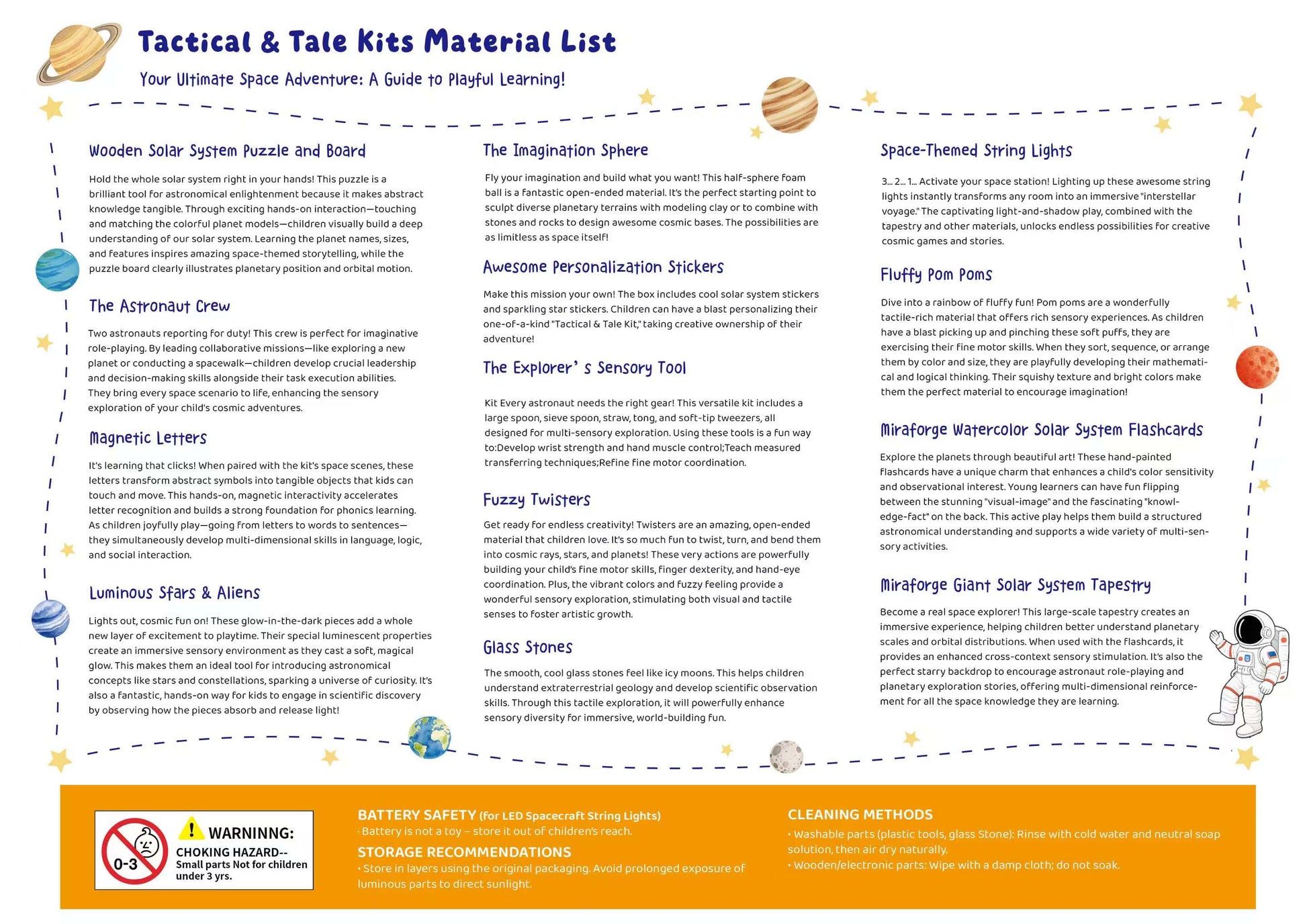 The Space Tactical & Tale kit features a variety of theme-based play elements inspired by space exploration, along with multiple functional tools designed to enhance hand-eye coordination. It also includes abundant open-ended play materials to encourage creative and imaginative expression. This kit is designed to support children’s growth across various developmental areas.